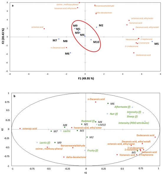 Thirty attributes showed significant differences among all studied samples. There were statistically significant differences for five visual descriptors (external and internal color, brightness, color homogeneity, and the presence of eyes), six olfactive descriptors (overall intensity PDO ID, lactic, sheep, roasted, fruity (pineapple), and butter), six textural descriptors (touch, firmness, elasticity, crumbliness, graininess, and creaminess), five basic taste descriptors (sourness, saltiness, umami, sweetness, and bitterness), and eight flavor descriptors (intensity, lactic, sheep, roasted, fruity, aftertaste, nutty, and spicy). A partial least squares plot (PLS) was shown to allow a better understanding of the relationships among the ten cured ewes’ cheeses, using (i) volatile compounds and (ii) descriptive sensory attributes (Figure 3b). PDO samples (M1, M3, M4, M9, and M10) that can be associated with lactic odor and three flavors (lactic, roasted, and fruity) that can be associated with the three main volatiles situated in the plot near the samples (ethyl hexanoate, phenylacetaldehyde, and δ-decalactone). As was previously described, these compounds are reported in the literature as possible markers of a more advanced maturation stage. Additionally, in Figure 3a, non-PDO samples (M2, M5, M6, M7, and M8) were more dispersed in the space, showing more heterogeneity within this group.
