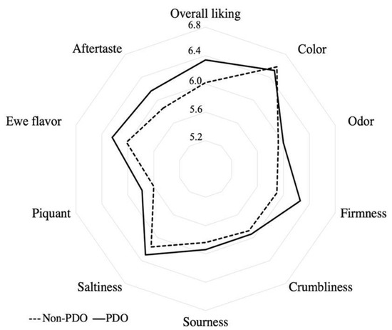 Sensory profiles of PDO and non-PDO Spanish cured ewes’ cheeses reported by the consumer panel are plotted in Figure 4. Significant differences (p < 0.001) between the PDO and non-PDO groups were found for all attributes studied by consumers (Table 6). In general, PDO cheeses showed higher scores than non-PDO ones, except for the color. As a result, it is noticeable that cheeses covered by the PDO obtained a consumer satisfaction degree higher than non-PDO samples.