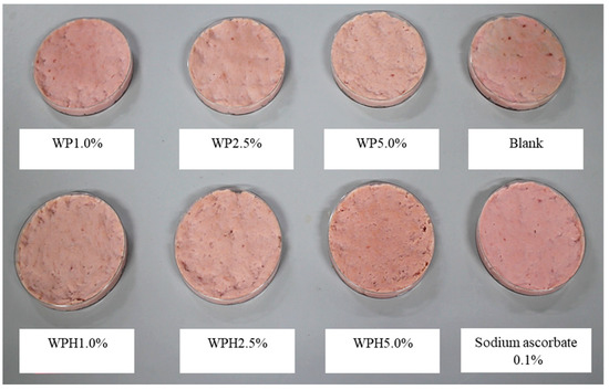 As shown in Figure 1, the meat color of the sausage model was affected by WP or WPH addition. The sausage model treated with 5.0% WPH appeared to be the most reddish among the tested sausages. Similarly, the sausage model supplemented with 1.0% WP also showed a reddish appearance compared to the control; however, this reddening effect was not observed at higher WP concentrations.