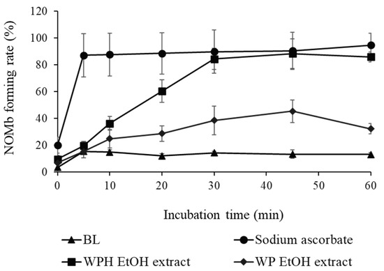 Nitrosyl myoglobin (NOMb)-forming activity of WP EtOH and WPH EtOH in the myoglobin (Mb) solution. The change in NOMb-forming rate of WP EtOH and WPH EtOH with incubation time is shown. Error bars represent SD. Data are presented as mean ± SD (n = 3). BL, blank.