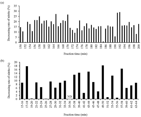 Assessment of the NO2−-decreasing activity of different WPH EtOH fractions. (a,b) show the NO2−-decreasing rate of the fractions based on gel filtration chromatography (during a 150–200 min fractionation time) and reversed-phase chromatography (during a 15–64 min fractionation time), respectively. The other fractions not shown in the figure had low activity. Data are expressed as the mean of triplicate experiments. ND, not detected.