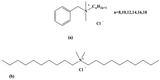 Chemical structures of BAC (a) and DDAC (b) biocides.