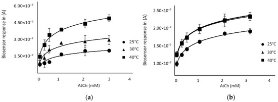 Response of the biosensor as a function of substrate (AtCh) concentration at different temperatures: (a) BChE-based biosensor (b) AChE-based biosensor.