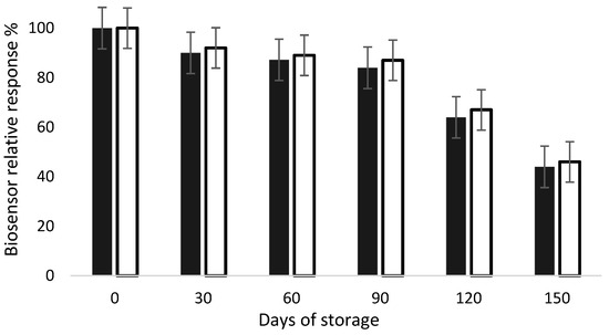 Relative response of AChE (dark bars) and BChE (white bars) biosensors during storage at 4 °C. The biosensor response was tested in presence of acetylthiocholine at 1 mM, as described in inhibition experiments.