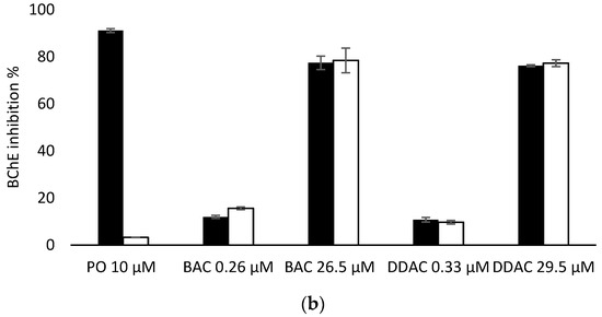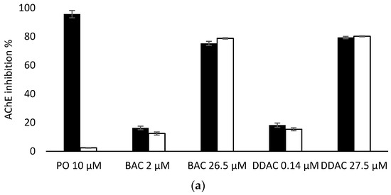 Comparison of AChE (a) and BChE (b) sensor inhibition by BAC and DDAC at different concentrations, in absence (dark bars) or presence (white bars) of PTE at 0.8 U/mL and PO insecticide at 10 µM.