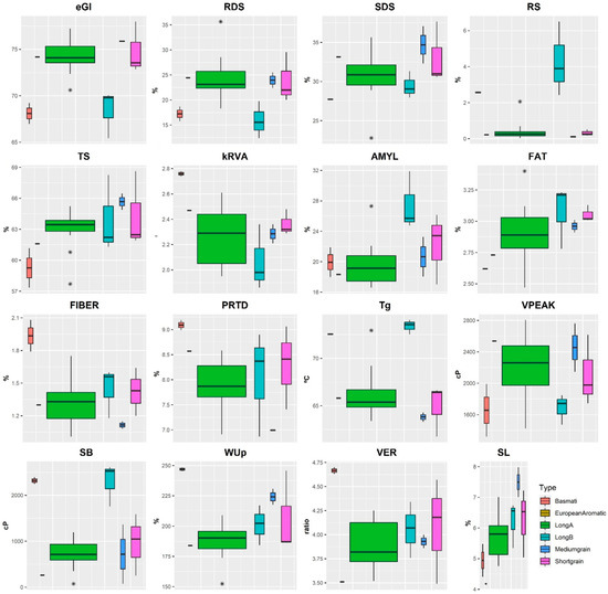 Boxplots of rice commercial types according starch digestion parameters, nutritional composition, cooking and viscosity properties. * RDS—rapidly digestible starch; SDS—Slowly digestible starch; RS—Resistant starch; TS—Total starch; kRVA—kinetic constant of starch hydrolysis RVA model; AMYL—amylose content; FAT—fat content; FIBER—fibre content; PRTD—protein content; Tg—Gelatinization temperature; VPEAK—Viscosity Peak; SB—Setback; WUp—Water uptake; VER—volumetric expansion ratio; SL—Solids leached.