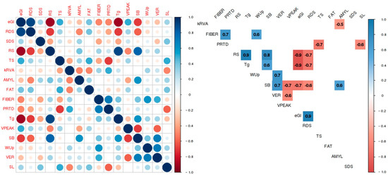The obtained correlation coefficients reveal interesting relationships between eGI and various parameters, including starch digestion parameters, as well as nutritional, cooking, and viscosity parameters measured in this study (Figure 2). Various factors could account for these differences. In terms of starch digestion parameters, significant differences were found for RS (p ≤ 0.05). Rice varieties displaying higher RS values tend to exhibit lower eGI (r = −0.90) and decreased RDS values (r = −0.70). These findings are consistent with assertions from several authors, affirming the direct impact of RS content on starch digestibility [10]. Furthermore, it was observed that samples with significant/high starch digestion parameter RDS content also exhibited higher eGI values (r = 0.90). RDS represents the starch fraction that is completely digested in the small intestine, contributing to an increase in blood glucose levels. On the contrary, RS comprises starch that is not absorbed in the small intestine but is instead fermented in the large intestine, offering benefits to colonic health and contributing to low starch digestibility [34]. Three parameters showed a negative correlation with eGI: RS from the starch digestion parameter group (r = −0.90), and SB and Tg from the viscosity parameter group (r = −0.70 and r = −0.90, respectively).