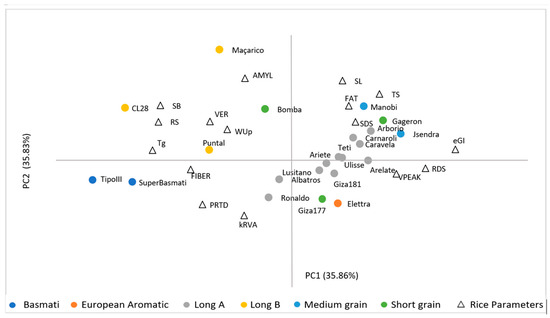 The PC1 represented the eGI, RDS, RS, and SB parameters. The second principal component (PC2) was mainly attributed to AMYL contents, and SL, PRTD, kRVA parameters. The distribution obtained from the principal components showed that rice varieties with lower eGI have lower digestion rates, and lower RDS contents and higher RS contents and Tg, as well as a greater tendency to retrogradation (SB). As expected, the relationships obtained from the PCA are in agreement with the previous correlations results. The distribution of the 22 varieties between the PC1,2 shows a clear separation between three groups of rice commercial types: 1—Long A, Medium, Short grain; 2—Long B; 3—Basmati.