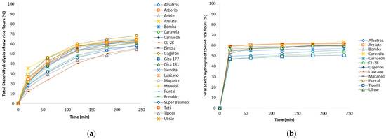 Conversely, the cooked rice samples exhibited considerably higher total hydrolysis rates, ranging from 46.3% to 59.6% within the same digestion period (Figure 4b). However, comparing the digestibility rates of raw or cooked rice the varieties order remained similar, the raw rice varieties with lower hydrolysis index (HI), such as CL28 (Long B rice), TipoIII and Super Basmati (Basmati rice’s), also maintain the lowest HI after cooking. Caravela, Ulisse and Arelate varieties (Long A types) showed higher HI before and after cooking.
