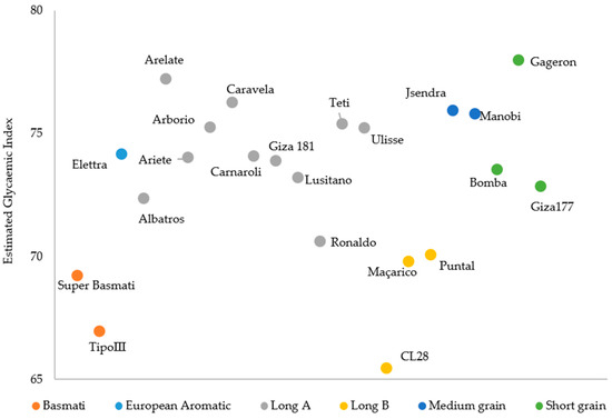 As seen in Table 2, the Basmati and Long B rice types show lower eGI (68.10 ± 1.61 and 68.44 ± 2.59) compared with the other rice types (>70). The Long A type is the class with great number of varieties and denotes some variability among them (74.33 ± 1.85), with Albatros, Lusitano and Ronaldo standing out as varieties with the lowest eGI (Figure 5).
