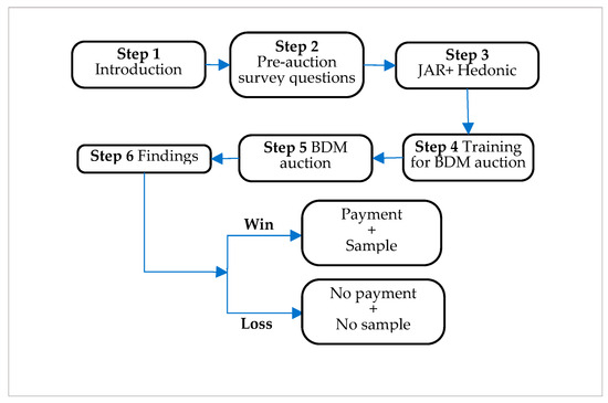 The consumers’ trade-off between quality and price can be explored regarding how sensorial aspects affect overall liking and value perception [8]. This is usually achieved in terms of willingness to pay (WTP), i.e., the maximum amount of money a consumer is willing to pay to buy a good. WTP can be studied using hypothetical and non-hypothetical value elicitation methods. Among non-hypothetical ones, experimental auctions have gained popularity among researchers over the past two decades due to their ability to mimic real market situations. Specifically, real products are exchanged for real money, thus allowing the WTP to be measured. According to Lusk and Shogren [40], this aspect is why non-hypothetical value elicitation methods can provide a more accurate and realistic value for the WTP. The Becker–DeGroot–Marshak (BDM) [41] auction mechanism, in particular, is very suited for conducting in-field auctions involving single participants [40]. As with other non-hypothetical value elicitation methods, the auctioned product, once presented, is usually used for a tasting experience.