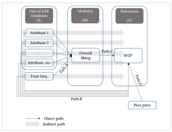 Finally, a Sobel test [44] via the structural equation model (SEM) was carried out to determine whether the consumer’s overall liking mediates the effect of the binary “out-of-JAR” attributes on the WTP (Figure 2). SEM is a type of multivariate analysis that combines factor and path analysis. SEM focused exclusively on path analysis because no latent variables are involved in this study. The structural model, expressed in terms of the relationships between variables, was estimated and tested to evaluate the theoretical links [50]. The adjusted Baron and Kenny approach [45] was used to test the mediating effect, which consists of four steps. First, the direct relationship between independent and moderating variables (X → M) is assessed. Second, the direct relation between mediating and dependent variables (M → Y) is estimated. Third, the direct relation between independent and dependent variables (X → Y) is measured. Last, the significance of the Sobel test (z-value ≥ 1.96, p ≤ 0.05) is checked. This approach may potentially result in three different outcomes. First, should one of the X → M and M → Y relations be not significant, no mediation effect would exist. Second, a complete mediation would occur if Sobel’s z-test is significant, but the direct relation between independent and dependent variables (X → Y) is not. Finally, partial mediation occurs when all four steps above are significant. Emphasis is put on how consumers’ overall liking indirectly mediates between “out-of-JAR” dummies variables and fruit intake (1 = “Never”; 5 = “Every day”) and consumer WTP. This is estimated based on the direct effect of the binary “out-of-JAR” variables and the fruit intake variable on the mediator variable (Path A, i.e., X → M), on the one hand, and the direct effect of the mediator variable on the dependent variable WTP (Path C; i.e., M → Y), on the other hand. Calculations are carried out employing the medsem package [51]. The model also includes regression paths between consumers’ knowledge of average pear prices (How much does a kilo of pears usually cost in EUR/kilo when you shop for them?) and consumers’ WTP to detect the robustness of WTP judgements (Path D). The goodness of fit of the SEM model has been evaluated using the cutoff criteria of the root mean square error of approximation (RMSEA; values close to 0.08 or below), the standardised root mean square residual (SRMR; values close to 0.08 or below), the comparative fit index (CFI; values above 0.95), the normalised chi-square (CMIN/DF; values close to 5 or below), and the standardised loading estimates (0.30 and above) [52,53]. Convergence validity was tested by looking at the relative average variance extracted (AVE; close to or above 0.05). The structural model was evaluated in terms of the coefficient of determination (R2; 0.25 = weak, 0.50 = moderate, 0.75 = substantial) and path coefficients (between −1 and +1). A bootstrapping procedure with 1000 sub-samples was performed to evaluate the significance of path coefficients.