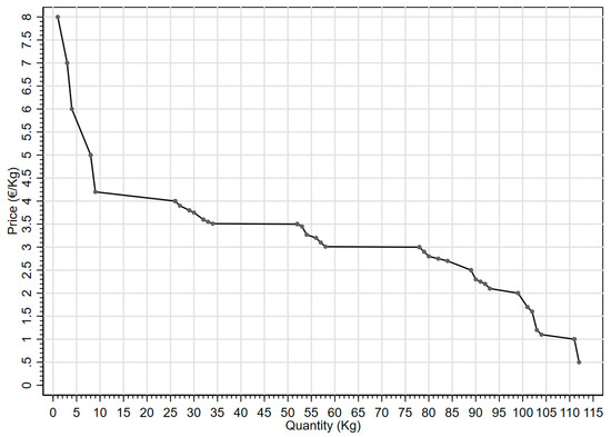 In particular, parameter β, being defined as (%∆ Quantity)/(%∆ Price) [54], clearly represents an elasticity. The relationship comprises 35 observations, i.e., 35 unique prices for 35 pear Angelica quantities. A total 35 observations out of 112 were obtained because of multiple equal price values. The estimates are and and significant. It is worth emphasising that the elasticity of the demand curve concerning price is equal to −1.60. The sign reflects the downward-sloping behaviour typical of demand curves. More precisely, a 1% increase in the pear ‘Angelica’ price reduces the quantity consumed by 1.60%.