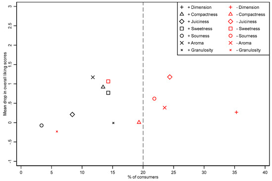 Mean drops in overall liking as a function of the percentage of consumers that checked an attribute “out-of-JAR”. Legend: −Dimension= ”too less calibre”, +Dimension= ”too much calibre”, −Compactness = “too less compact”, +Compactness = “too much compact, −Juiciness = “too less juicy”, +Juiciness = “too much juicy”, −Swetness = “too less sweet”, +Swetness = “too much sweet”, −Sourness = “too less sour”, +Sourness = “too much sour”, −Aroma = “too less aroma”, −Aroma = “too much aroma”, −Granulosity = “too less granulose”, +Granulosity = “too much granulose”.