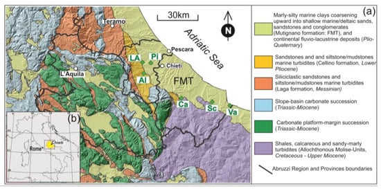 (a) Simplified geological map showing the different lithologies characterizing the Abruzzo region (modified from a geological map of Italy on a 1:50,000 scale, sheets: 361; www.isprambiente.gov.it/Media/carg/note_illustrative/361_Chieti.pdf, accessed on 09 October 2023), processed using Q-GIS tools and overlaid on a 3D topographic digital elevation model of Italy with a 10 m cell size [62]. Green diamonds indicate the localization of the analyzed olive orchards: LA, Loreto Aprutino; Pi, Pianella; Al, Alanno; Ca, Casoli; Sc, Scerni; Va, Vasto. (b) Location of Abruzzo region in Italy.