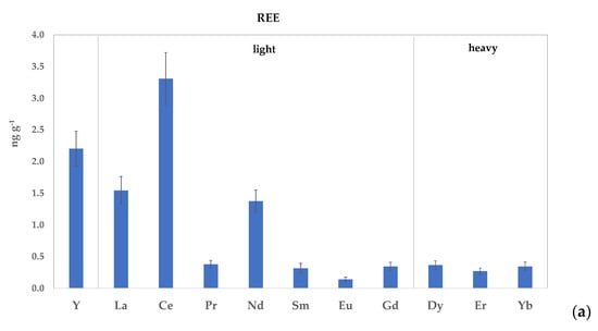 REEs include ultra-trace elements (yttrium) and lanthanides with an atomic number ranging from 57 and 71, such as La (lanthanum), Ce (cerium), Pr (praseodymium), Nd (neodymium), Pm (promethium), Sm (samarium), Eu (europium), Gd (gadolinium), Tb (terbium), Dy (dysprosium), Ho (holmium), Er (erbium), Tm (thulium), Yb (ytterbium), and lutetium (Lu). Ordering elements by increasing atomic number, the REEs from La to Gd are considered light rare earth elements (LREEs), with more basic behavior and higher solubility, whereas the REEs from Tb to Lu are considered heavy rare earth elements (HREEs), with more acid behavior and lower solubility [51,60,61]. Additionally, middle rare earth elements (MREEs), which overlap the two groups, include Sm (samarium) and Eu (europium). Typically, in soils, the LREE concentrations are generally greater than the HREE concentrations [51].