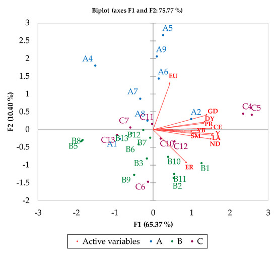 According to the loading plot (Figure S1), the vector lengths of Y, La, Ce, and Nd represented the largest contribution of the variance in the first component. They were located close to each other, with a small angle in between; out toward the same periphery, they covariation was strongly positive (very similar patterns) and proportional to the degree distance from the PC origin. On the other side, europium (Eu), especially, and erbium (Er), mainly contributed to the second component. The large angle between Eu and Er highlighted the weak correlation. Sm and Yb, with the shortest vector and being closest to the origin, presented the lowest absolute variances, and might be better explained by other factors [57].