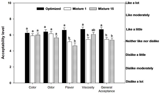 In general, the optimized beverage had scores higher than 6.0 (on a seven-point scale), which corresponded to “like a little” on hedonic terms, specifically, a general acceptability of 6.72. This suggests that all attributes evaluated were well-received and accepted by the consumers. There was no statistically significant difference between the optimized beverage and mixtures 1 and 15 regarding color and odor. In contrast, there were significant differences regarding flavor and general acceptability, where the optimized beverage was better evaluated, suggesting that it had a good sensory balance.