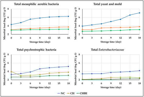 Microbial load (log CFU g−1) of fruit salads during storage (NC: non-coated; CH: chitosan-coated; CHBE: bergamot juice powder extract-enriched chitosan-coated).
