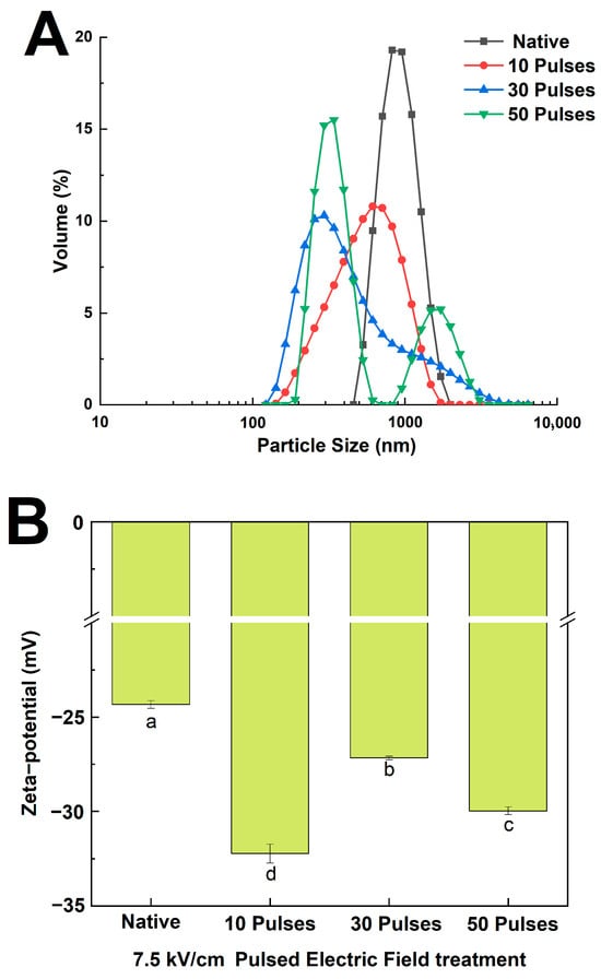 3.2. Effect of PEF Treatment on the Particle Size and Zeta Potential of QPIs