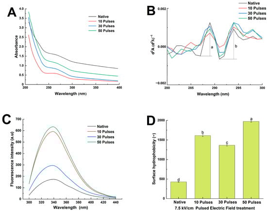 3.5. Effects of PEF Treatment on the UV Spectrum, Intrinsic Fluorescence Spectrum, and Surface Hydrophobicity of QPIs
