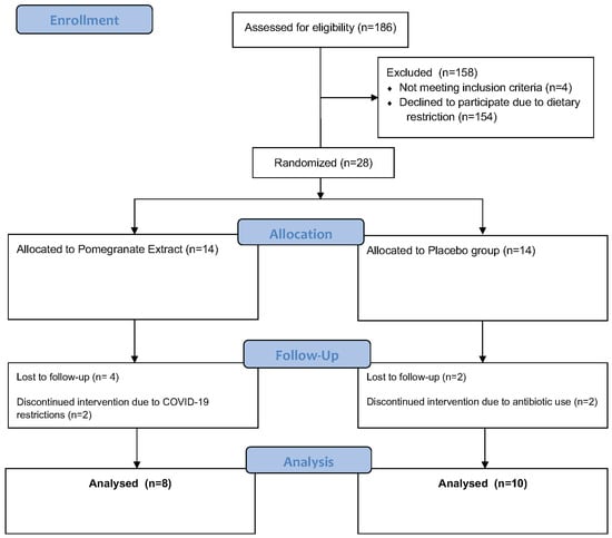 This four-week, double-blind, placebo-controlled study was conducted between November 2020 and March 2021 as a pilot clinical trial [6]. This study was approved by the Institutional Review Board (IntegReview Ltd., Austin, TX, USA) and registered at www.clinicaltrials.gov (NCT04596722). Written informed consent was obtained from all participants prior to any participation. Healthy males and females living in the Sacramento region, ages 25–55, were recruited and screened for eligibility. All study procedures were performed at Integrative Skin Science and Research in Sacramento, CA. A total of 186 individuals were assessed for eligibility, of which 28 subjects met inclusion criteria and were randomized and pre-allocated into the following two study groups using a computer-based randomization generator with blinded sealed envelopes. The pomegranate extract (PE) group (n = 14) received an oral supplement (Pomella®, Verdure Sciences, Inc. Noblesville, IN, USA) and the control group (n = 14) received an oral placebo for daily consumption for four weeks [6]. The Pomella® supplement utilized in this study was provided by Verdure Sciences, Inc. (Noblesville, IN, USA) and consisted of the following ingredients: pomegranate whole fruit extract containing 75 mg punicalagin. The placebo supplement utilized in this study contained the following ingredients: 97.67% maltodextrin, 0.10% tartazine color, 0.22% brown color, and 2.01% aerosol. In the control group, 2 subjects were lost to follow-up after screening and 2 discontinued the study intervention due to antibiotic use. In the PE group, 4 subjects were lost to follow-up after screening and 2 discontinued the study intervention due to concerns related to COVID-19 [6]. The flow of participants throughout the study is depicted in Figure 1.