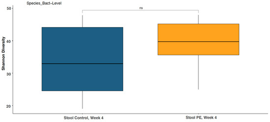 Stool Shannon diversity at the bacterial species level was not significantly changed with PE supplementation compared to the control group at week 4. ns = not statistically significant.
