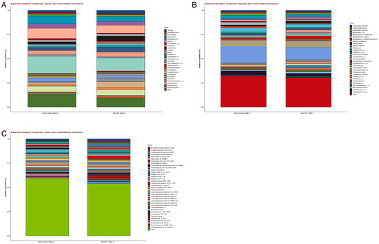Shifts in the gut microbiome were noted in the (A) genus, (B) species, and (C) strain levels after four weeks of PE supplementation.