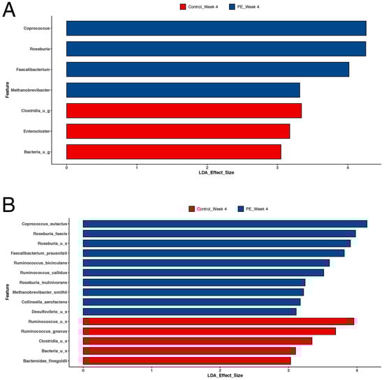 Lefse analysis of the microbiome comparing shifts in the microbiome after 4 weeks of PE supplementation compared to placebo (control) supplementation. Results are shown for both (A) genus and (B) species. LDA effect size > 2 was considered statistically significant. There were significant increases in Coprococcus eutectus, Roseburia faecis, Roseburia inullnivorans, Ruminococcus bicirculans, Ruminococcus calidus, Faecalibacterium prausnitzii, Methanobrevibacgter smithii, and Collinsella aerofaciens.