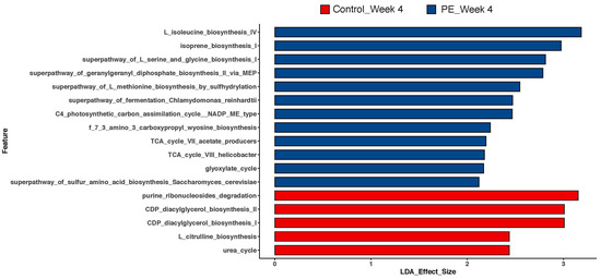 LEfSe analyses of MetaCyc metabolic pathways after 4 weeks of PE or placebo supplementation from the gut microbiome. LDA effect size > 2 was considered statistically significant.