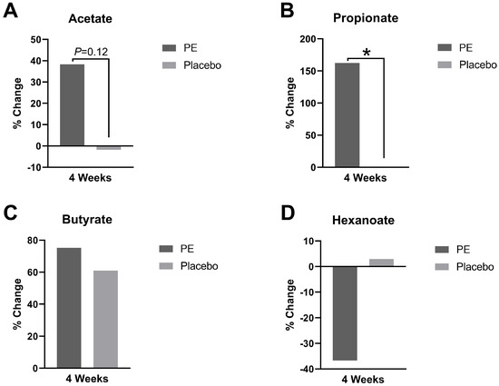 Plasma short-chain fatty acid levels were quantified and presented as percent change from baseline after 4 weeks of supplementation with PE or placebo. The plasma levels of (A) acetate, (B) propionate, (C) butyrate, and (D) hexanoate were analyzed. * p < 0.05.