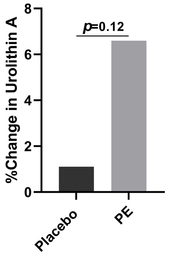 Those in the PE group had a greater increase in their urolithin A levels compared to placebo supplementation (6.6% vs. 1.1%, p = 0.13, Figure 7). When considering how many of the participants had at least a 10% increase in their urolithin A plasma levels, the PE supplementation group had a greater likelihood of achieving a 10% increase compared to those in the placebo group (p = 0.06).