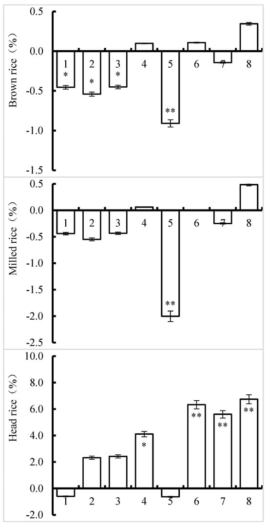 Effect of silicon and zinc fertilizer combinations on processing quality of Nanjing 46. The data in the figure are the average differences between treatments and CK. * and ** represent significant differences at 5% and 1%, respectively. One to eight indicate the Si-B, Si-L, Zn-B, Zn-L, Si-B + Si-L, Zn-B + Zn-L, Si-B + Zn-B, and Si-L + Zn-L treatments, respectively, compared to the control.