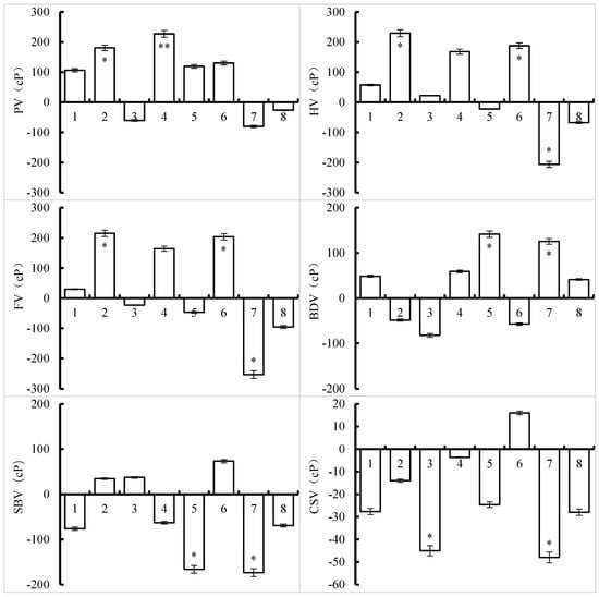 Effects of silicon and zinc fertilizer combinations on the RVA profile of Nanjing 46. The data in the figure are the average differences between treatments and CK. * and ** represent significant differences at 5% and 1%, respectively. One to eight indicate the Si-B, Si-L, Zn-B, Zn-L, Si-B + Si-L, Zn-B + Zn-L, Si-B + Zn-B, and Si-L + Zn-L treatments, respectively, compared to the control.