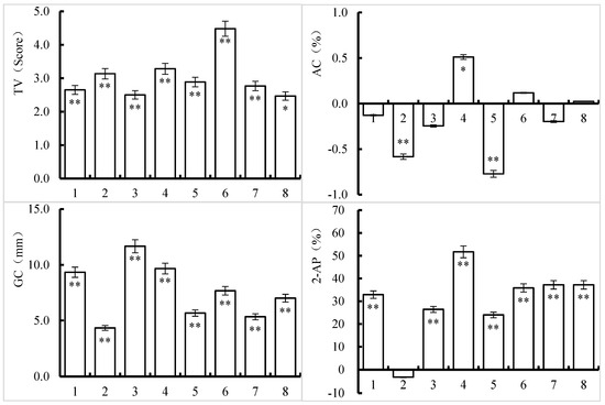 Statistical analysis was conducted using SPSS Statistics software (version 16.0, Chicago, IL, USA). Two-way year and treatment analysis of variance (ANOVA) was performed to identify significant differences (p ≤ 0.05) among the years, treatments, and their interactions. Due to the differences between year divisions and the interactions between years and treatments, except for the significant level of 2-AP content (p < 0.01), all other traits were not significant. Therefore, take the average of two years for multiple comparisons. The data were presented as the mean ± standard deviation (SD). For the traits with significant differences according to ANOVA, Duncan’s SSR multiple range method was used to compare the differences among treatment means. The effect of each treatment was evaluated in light of how it differed from that of the control (CK). The effects of the different treatments were compared using the difference in average values between the different treatments.