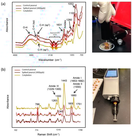 Representative raw spectra of a control peanut, a peanut with aflatoxins (400 ppb), and a pair of peanut cotyledons collected using (a) a portable FT-IR spectrometer and (b) a handheld Raman instrument (1064 nm).