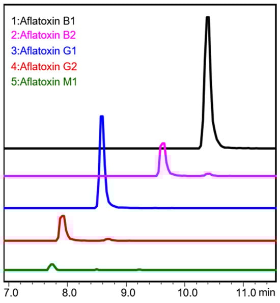 2.3. Aflatoxin Spiking Verification Analysis (Ultra-High-Performance Liquid Chromatography–Tandem Mass Spectrometry (uHPLC-MS/MS) Analysis) of Peanuts