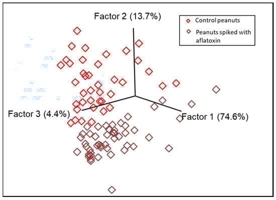 Given the abundance of information within spectral data, multivariate data analysis is required to extract meaningful information []. Principal component analysis (PCA), an unsupervised technique, was performed to explore the natural clustering differentiating the control peanuts and the peanuts with aflatoxins. However, soft independent modeling of class analogy (SIMCA), a supervised technique, was relied to develop predictive classification algorithms that can be used to assign classes to unknown samples.