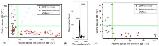 PCA was utilized as an initial step before applying supervised pattern recognition methods. Results from PCA analysis demonstrated a natural clustering, differentiating the control from contaminated peanuts (Figure 3). SIMCA was selected for the rapid detection and classification of peanuts contaminated with aflatoxins due to its advantage in minimizing the overfitting problem compared with other common supervised techniques (i.e., support vector machine (SVM), partial least-squares discriminant analysis (PLS-DA), and artificial neural network (ANN)) [,]. The optimum numbers of principal components (PCs/factor) for each class under SIMCA model were defined based on explained variance to avoid overfitting and underfitting [,]. To generate the FT-IR SIMCA training model for aflatoxins, the spectral range (1799–1446 cm−1, 190 data points) that contained more signatures related to aflatoxins was selected. Eight principal components were deployed for the class of peanuts with aflatoxins, and six principal components were utilized for the class of peanuts without aflatoxins in the SIMCA model generated using the FT-IR spectra, explaining 99.4% and 98.8% of the variance, respectively. Peanuts with aflatoxins were well separated from control peanuts, with an interclass distance (ICD) of 3.63 (ICD > 3), suggesting large Euclidian distances between the centers of clusters (important for identification) and yielding distinctive clustering patterns. The SIMCA Coomans plot (Figure 4a) demonstrated the performance of the supervised classification model via determining class membership based on distance from the boundaries (vertical and horizontal lines, 95% confidence limits) of the classes (control peanuts and peanuts spiked with aflatoxins) in the pairwise plot. Control peanuts were well separated from peanuts with aflatoxins based on the unique infrared spectral patterns, and they were all plotted onto the lower right quadrant of the diagram (Figure 4a). Some peanuts with aflatoxins were plotted in the lower left quadrant, representing similarity with control peanuts. However, through the cross-validation analysis, all the aflatoxin-contaminated peanuts were accurately predicted into their assigned class, with no misclassification. The discriminating power plot (Figure 4b) showed the variables having a prevalent impact on sample classification by maximizing the difference between different clusters and minimizing the difference between samples within clusters []. The results showed that bands centered at 1670 cm−1 and 1645 cm−1 contributed most to detecting peanuts with aflatoxins, which could be attributed to the C=C stretching vibration of the ring structures of aflatoxins []. Shen et al. compared spectral profile differences by changing the aflatoxin content in brown rice, and they reported that the pronounced differences at 1644 cm−1 might be related to fungal infection in the brown rice, in agreement with our finding [].