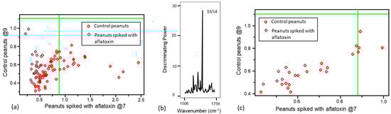 To generate the Raman SIMCA training model for aflatoxins, the spectral range (1506–1756 cm−1, 56 data points) that contained more signatures related to aflatoxins was selected. The SIMCA classification analysis using Raman spectra showed limited ability for discriminating peanuts spiked with aflatoxins below 100 ppb; therefore, the models were only generated by including spiked peanuts with aflatoxin levels ≥ 100 ppb (100, 200 and 400 ppb). The classification model employed nine principal components to explain 89.5% of the variance in the class of peanuts spiked with aflatoxins, and seven principal components were utilized to explain 93.0% of the variance in the class of peanuts without aflatoxin. The Coomans plot showed a limited separation of the two classes (in the lower left quadrant of Figure 5a), and control peanuts and peanuts spiked with aflatoxins only had an ICD of 0.6 (ICD < 3), with no misclassification, showing that limited Raman spectral features were resolved for identifying aflatoxins. The discriminating power plot (Figure 5b) showed that bands centered at 1654 cm−1, associated with C=O stretching vibrations in the aflatoxins’ structure, were important for differentiating and detecting peanuts with aflatoxins [].