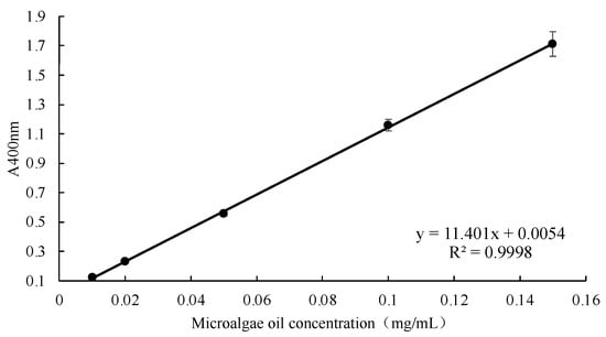 The UV absorption spectrogram reveals the characteristic absorption wavelength of chlorella oil to be 400 nm, a wavelength strategically chosen for the quantification of chlorella oil content. Concentration gradients of 0.01, 0.02, 0.05, 0.10, and 0.15 mg/mL of the petroleum ether solution of chlorella oil were established, and absorbance measurements were conducted at the specified 400 nm wavelength. The resultant standard curve, as illustrated in Figure 1, was formulated with chlorella oil concentration as the horizontal coordinate (x) and absorbance values as the vertical coordinate (y). The derived equation, y = 11.4010x + 0.0054 (R2 = 0.9998), was subsequently employed for the precise quantification of chlorella oil.