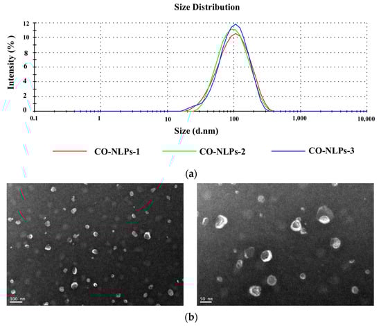 The CO-NLP demonstrated a mean particle size of 86.90 nm, displaying a singular peak shape indicative of a normal distribution. This characteristic underscores the uniformity and robustness of the liposome system, as illustrated in Figure 2a. The particle size distribution further affirmed uniformity, supported by a low PDI of 0.19. The CO-NLP exhibited a negative charge, as evidenced by its zeta potential of −25.05 mV. Notably, a significant zeta potential, whether positive or negative, acts as a deterrent to the mutual aggregation of liposomes, thereby enhancing their stability to a certain extent [].