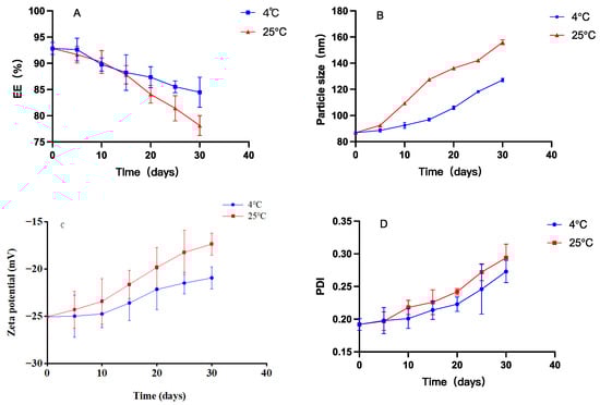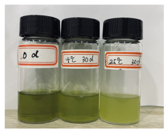 Figure 3 illustrates variations in EE, particle size, zeta potential, and PDI of CO-NLP during storage at temperatures of 4 °C and 25 °C. The graph depicts a decrease in CO-NLP EE from 92.84 ± 1.14% to 84.48 ± 2.86%, an increase in particle size from 86.90 ± 0.74 nm to 127.14 ± 1.37 nm, a rise in PDI from 0.19 ± 0.01 to 0.27 ± 0.02, and a decline in zeta potential from −25.05 ± 2.07 mV to −20.93 ± 1.17 mV after 30 d of storage at 4 °C. Although the EE experienced a slight reduction below 4 °C, it remained around 90% after 10 d, indicating stable CO-NLP that effectively prevented oil leakage. At 25 °C, the EE of CO-NLP decreased from 92.84 ± 1.14% to 78.14 ± 1.91%, accompanied by an increase in particle size from 86.90 ± 0.74 nm to 156.04 ± 1.83 nm, an elevation in PDI from 0.19 ± 0.01 to 0.29 ± 0.02 over a 30 d storage period, and a reduction in zeta potential from −25.05 ± 2.07 mV to −17.35 ± 1.15 mV. The enlargement of CO-NLP primarily stemmed from their nanoliposomal nature, coupled with their larger surface area and the resultant high surface energy, leading to unstable energy levels. Consequently, CO-NLP became susceptible to the clumping of particles, resulting in an increase in the size of liposomes. This view could also be found in the study of Wang et al. []. These results indicate reduced stability of nanoliposomes at 25 °C compared to 4 °C. As depicted in Figure 4, microalgae oil stored at 4 °C exhibited less color discoloration and particle aggregation compared to storage at 25 °C.