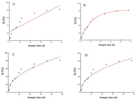 The in vitro release profiles of CO-NLP were determined by fitting four different release equations. (A) zero-level kinetic equation; (B) first-level kinetic equation; (C) Higuchi plane diffusion equation; (D) Retger-Peppas equation.