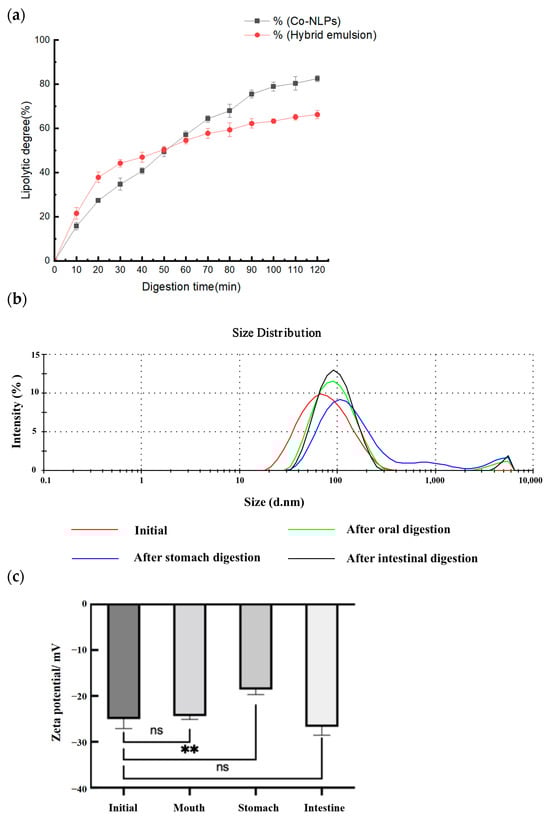 Assessment of the bioavailability and digestive properties of CO-NLP. (a) Kinetic curves illustrating the lipolysis of CO-NLP, Where the black curve represents the CO-NLP sample and the red curve represents the simple physical mixing emulsion made of microalgae oil and the embedding material; (b) Particle size of chlorella oil liposomes during digestion, among them, the red curve represents the undigested samples, the green curve represents the samples obtained after oral simulation digestion, the blue curve represents the samples obtained after gastric simulation digestion, and the black curve represents the samples obtained after intestinal simulation digestion; (c) Zeta potential changes during simulated digestion, where the ns refers to no significant difference between groups, while ** refers to significant difference between groups (p < 0.05).