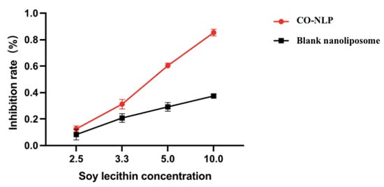 Pancreatic cholesterol esterase plays a pivotal role in the breakdown of dietary cholesterol esters via bile salt as well as the degradation of triglyceride-phospholipids, potentially impeding the absorption of dietary cholesterol []. The inhibition rate of CO-NLP on cholesterol esterase exhibited a dose-dependent nature, with a steady increase in inhibition rate corresponding to the rise in CO-NLP (Figure 7). Compared with blank nanoliposomes, the liposomes containing chlorella oil significantly increased the inhibitory activity of pancreatic cholesterol esterase, indicating the function of chlorella oil in lipid lowering.