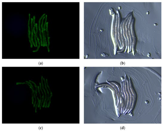 Representative images of dhs-3::gfp fluorescence in worms induced by blank nanoliposomes and CO-NLP. (a) Blank nanoliposome group (dark field, 100 px). (b) DMSO group (bright field, 100 px). (c) CO-NLP group (dark field). (d) CO-NLP group (bright field).