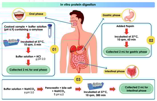 In vitro protein digestion was carried out according to the method described in a study by Trithavisup et al. [] and is summarized in Figure 1. All steps of the enzymatic digestion were performed at 37 °C with constant stirring (10 rpm) using a digital TRAYSTER (IKA Worke). In brief, two grams (dry basis) of ground cooked meat were mixed with 4 mL of buffer solution (120 mM NaCl, 5 mM KCl, and 6 mM CaCl2, pH 6.9) containing 75 U/mL α-amylase. The mixture was incubated for 5 min. Subsequently, the buffer (8 mL) was added to the mixture and the pH of the mixture was immediately reduced to pH 2.0 using 6N HCl. Pepsin was then added for a final concentration of 2000 U/mL. The mixture was then incubated for 60 min to mimic digestion in the gastric phase. Upon completion of this phase, 8 mL of the buffer were added and the pH of the mixture was then adjusted to pH 5.0 by adding 1.5 M NaHCO3. Solutions of pancreatin and bile salt were added to the mixture for final concentrations of 100 U/mL (based on trypsin) and 10 mM, respectively. The pH of the mixture was then adjusted to pH 6.0 using 1.5 M NaHCO3. The pancreatic reaction was carried out for 300 min. At the end of each phase, 2 mL of the mixture were collected. The pH of the collected mixture was adjusted to stop the enzymatic reaction before centrifugation at 3000× g for 30 min. Supernatant was filtered through a 0.2 μm membrane. The filtrate was used to determine free NH2 using the trinitrobenzenesulfonic (TNBS) acid method and free amino acid composition.