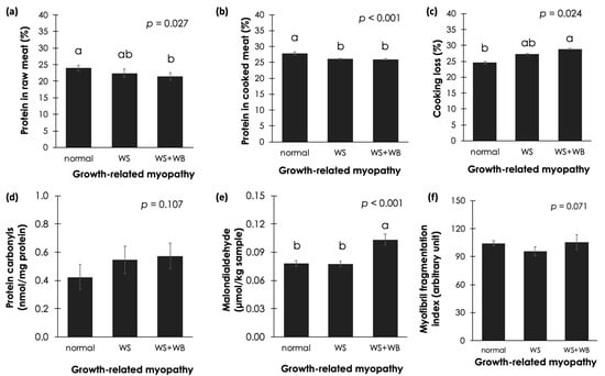 The effects of growth-related myopathies on the MFI are shown in Figure 2f. Although the MFI value for the WS samples tended to be lower than for the others, no significant differences in MFI were found among the treatments (p ≥ 0.05).