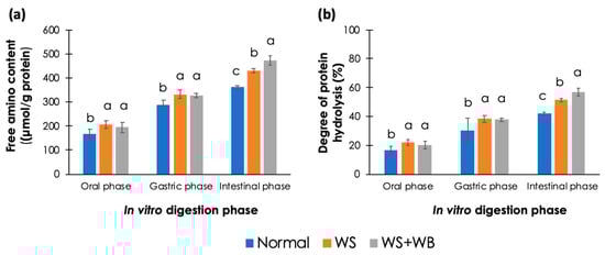 As shown in Figure 3, at all digestion phases, free NH2 and %DH of WS and WS + WB samples were greater than those of normal samples (p < 0.05). An increase in the free NH2 group indicated a greater hydrolysis of peptide bonds, resulting in an exposure of the NH2 group. The results indicate that the NH2 group was exposed to a greater extent in the abnormal samples.